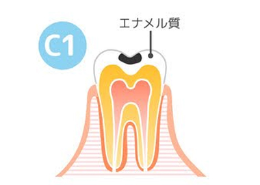 歯の表面のエナメル質に小さな穴が開いた段階。痛みなどの自覚症状はほとんどありません。ご自身での発見は難しく、歯科医院での検査で初めて見つかるケースがほとんどです。