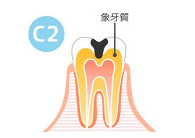 麻酔をして、むし歯を取り除いた後、C1のむし歯と同じようにプラスチックの材料で修復するか、範囲が大きい場合には